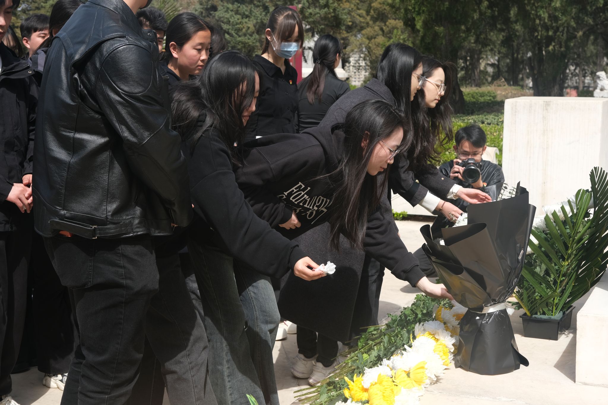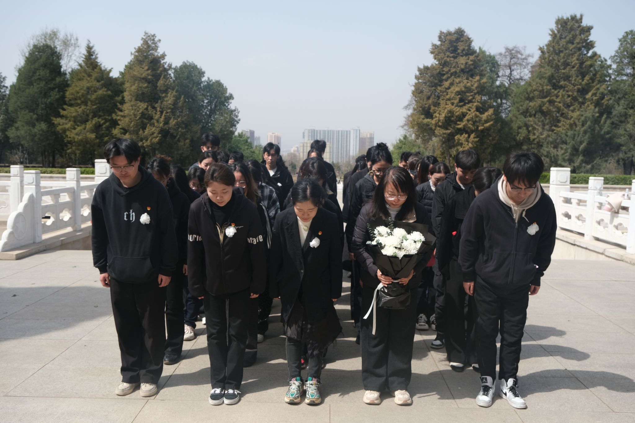 巍巍青山埋忠骨,朵朵白花祭英魂。活动现场,全体师生身着素装整齐列队于革命烈士墓碑前,教师代表向烈士纪念碑敬献花束,随后其他师生轮流献上白色花束,哀悼鞠躬并庄严宣誓,表达心中对革命先辈的缅怀和敬仰之情。仪式结束后,同学们前往烈士墓碑区,认真阅读碑文,了解烈士们的生平事迹,与先烈们进行了一场跨越时空的对话。