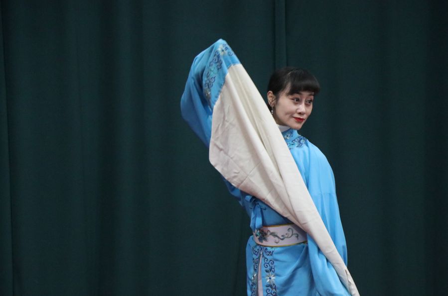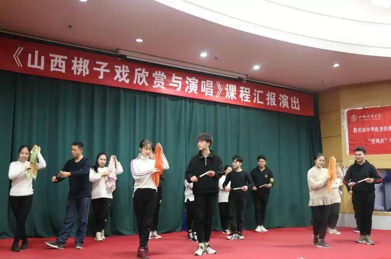 选修课程女生表演的戏曲折扇组合舞蹈、水袖展示充分展示了梆子戏旦行的婀娜多姿;