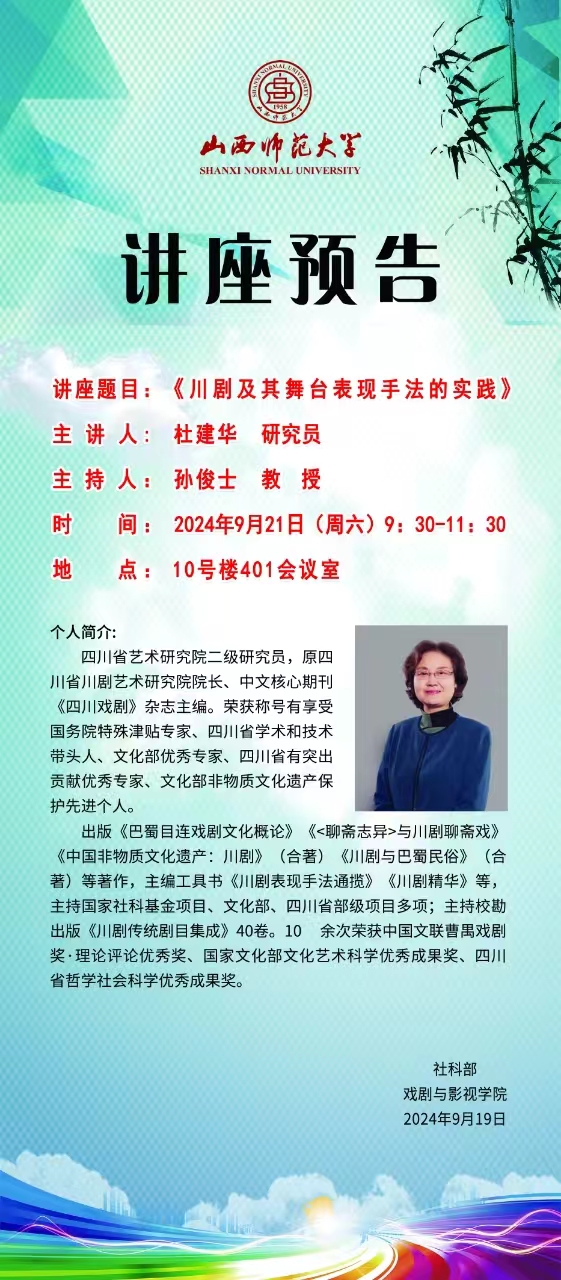 公司拟于2024年9月21日(周六)9:30—11:30在南区10号楼401会议室举办《川剧及其舞台表现手法的实践》讲座,主讲人为杜建华研究员,本次讲座由副经理孙俊士教授主持。