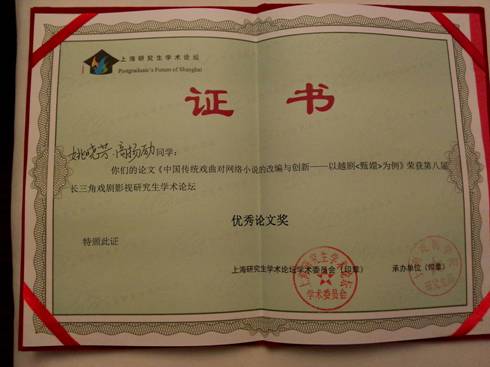 公司硕士研究生姚晓芳等的论文《中国传统戏曲对网络小说的改编与创新——以越剧<甄嬛>为例》在第八届长三角戏剧影视研究生学术论坛上荣获“优秀论文奖”。