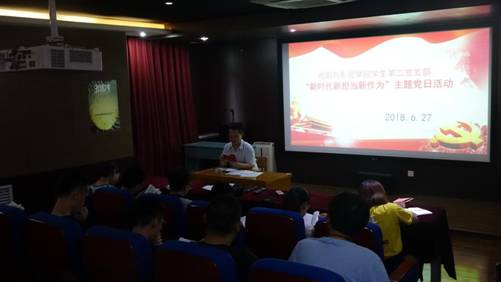2018年6月27日晚7:00,db旗舰员工第二党支部组织党员于科学会堂视听教室开展庆祝中国共产党成立97周年主题党日活动,激励全体党员贯彻落实中央办公厅关于“新时代新担当新作为”的通知。此次活动由支部书记刘于锋老师主持,支部副书记朱瑶老师和全体员工党员同志参加了本次会议。