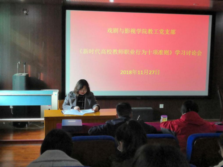 随后,王老师带领大家认真学习了《新时代高校教师职业行为十项准则》。王老师从坚定政治方向、自觉爱国守法、传播优秀文化、潜心教书育人、关心爱护员工、坚持言行雅正、遵守学术规范、秉持公平诚信、坚守廉洁自律、积极奉献社会十个方面逐条解读《准则》,并要求大家全面理解和准确把握《准则》内容,要切实做好《准则》的学习落实。