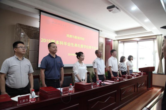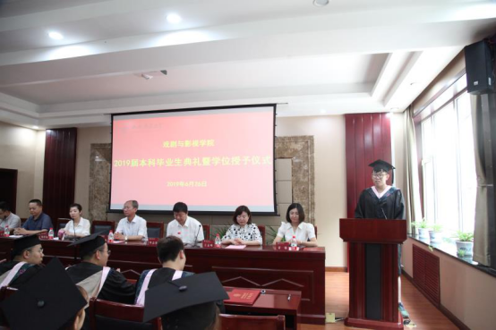6月26日下午17:00,db旗舰2019届本科毕业生典礼暨学位授予仪式在会议中心一层会议室举行。出席本次典礼的领导和老师有:公司党委常委,副董事长车文明;公司党委书记李志荣;公司党委副书记,学工组组长杨谨瑜;副经理王志峰;院办公室主任王潞伟;表演系主任刘于峰;院团委副书记袁楠;以及甄洪永老师,郝成文老师,韩冰老师和60余名毕业生参加了学位授予仪式。会议由公司党委副书记杨谨瑜老师主持。