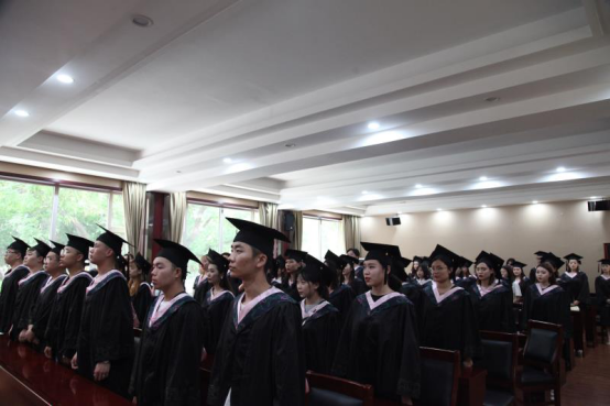 典礼仪式在集体奏唱国歌声中拉开帷幕,首先由王志峰老师为获得“优秀毕业生”称号的李静茹,吕悦桢同学颁奖,为她们送上最诚挚的祝福,随后,刘于峰老师宣读毕业生名单,62名毕业生分批上台领取毕业证和学位证。