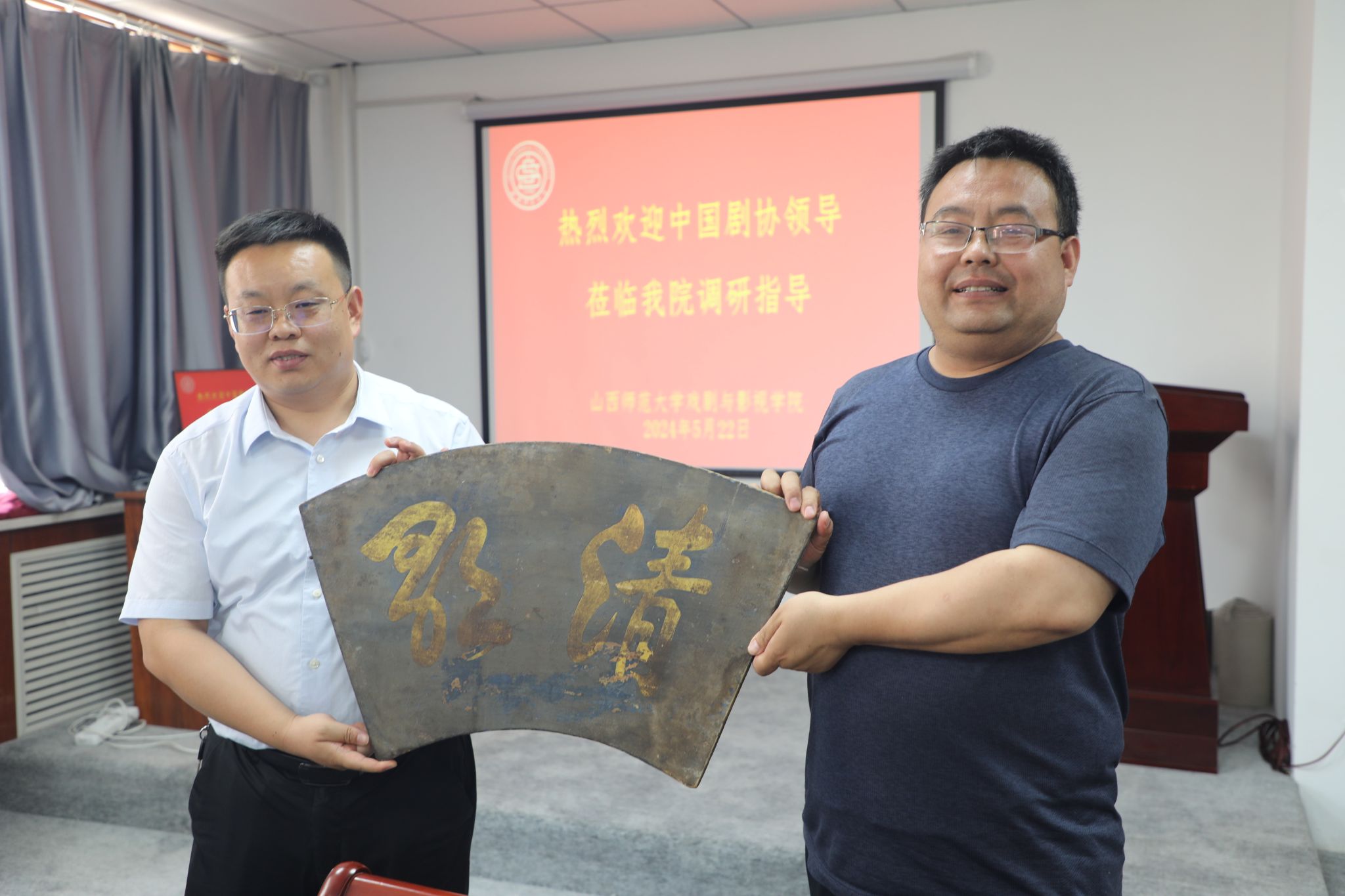 座谈会上,与会双方就团队建设、学术研究、戏曲文物文献搜集整理等方面话题展开交流。刘涛向公司捐赠了戏曲匾额和盔头。