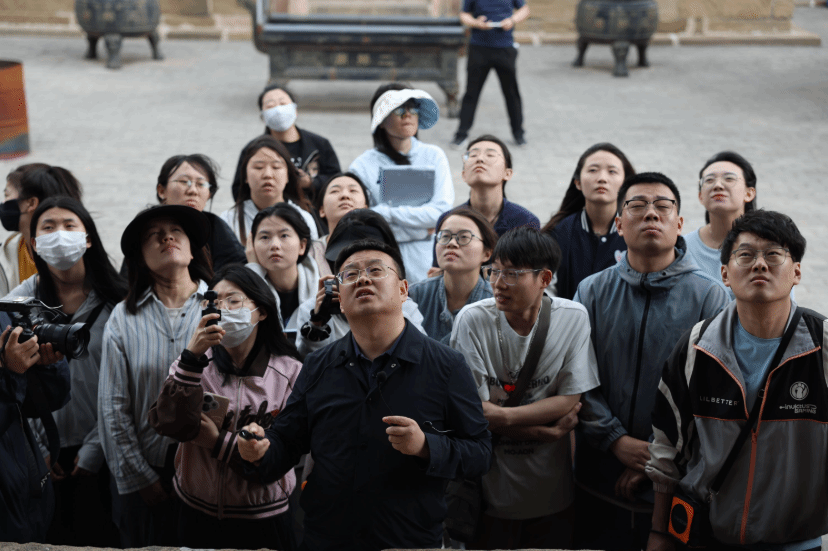 此次研学活动沿着晋城府城玉皇庙、关帝庙、周村东岳庙、壶关县神郊村真泽宫以及王报村二郎庙一线展开。在《戏曲文物鉴赏》课程负责人王璐伟教授的引导下,员工们手持测绘工具,在东岳庙戏台上测量古戏台面阔、进深和基高等建筑的基本数据,并带领员工近距离观察戏台藻井的穹顶结构,详细讲解了不同时期建筑梁栋的形态样式。