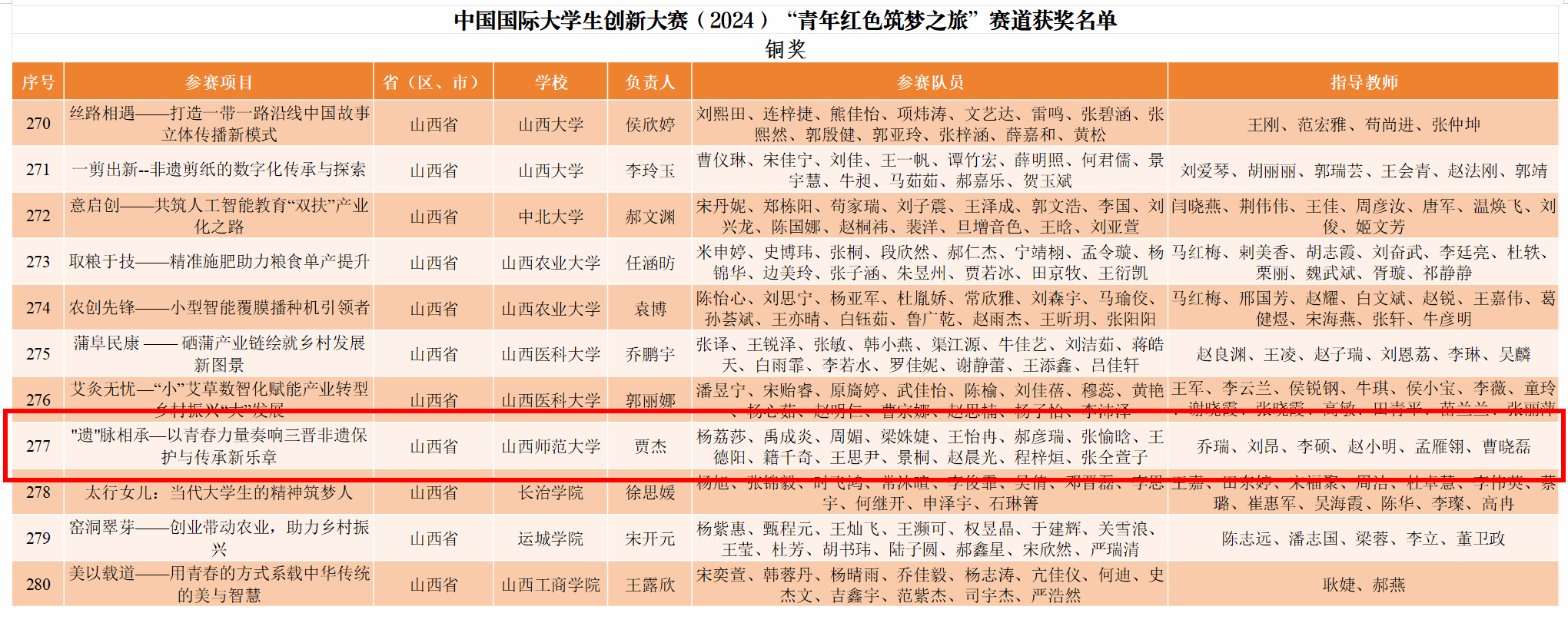 近日,教育部公布中国国际老员工创新大赛(2024)获奖名单,db真人参赛项目《“遗”脉相承——以青春力量奏响三晋非遗保护与传承新乐章》(指导老师:乔瑞、刘昂、李硕、赵小明、孟雁翎、曹晓磊)从全球153个国家、5406所高校的514万个项目中脱颖而出,斩获全国铜奖。这是公司首次在大赛“青年红色筑梦之旅”赛道斩获国家级奖项,实现历史性突破!