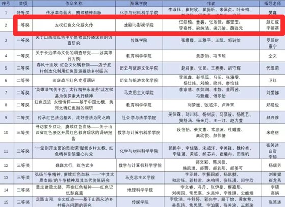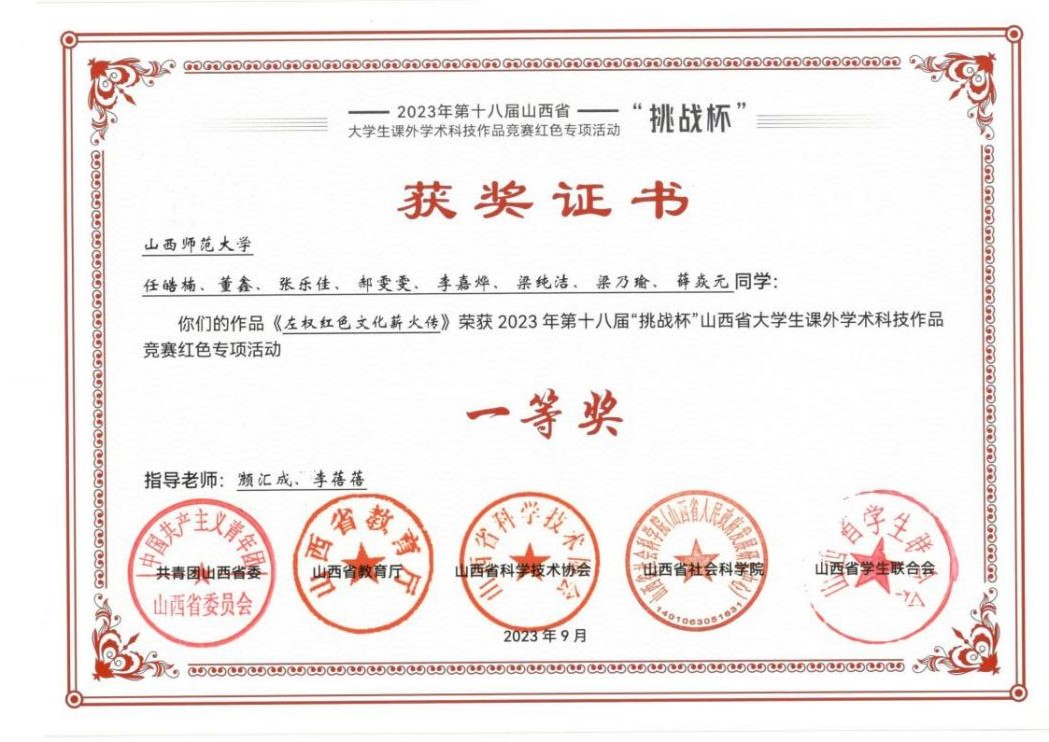 近日,第十八届“挑战杯”山西省老员工课外学术科技作品竞赛红色专项活动评选结果公布,公司以获奖总数 15 项的成绩,居于省内高校获奖榜首,取得了新突破。公司任皓楠、董鑫、张乐佳、郝雯雯、李嘉烨、梁纯洁、梁乃瑜、薛焱元等8位同学的参赛作品《左权红色文化薪火传》(指导教师:颜汇成、李蓓蓓)荣获省赛一等奖。