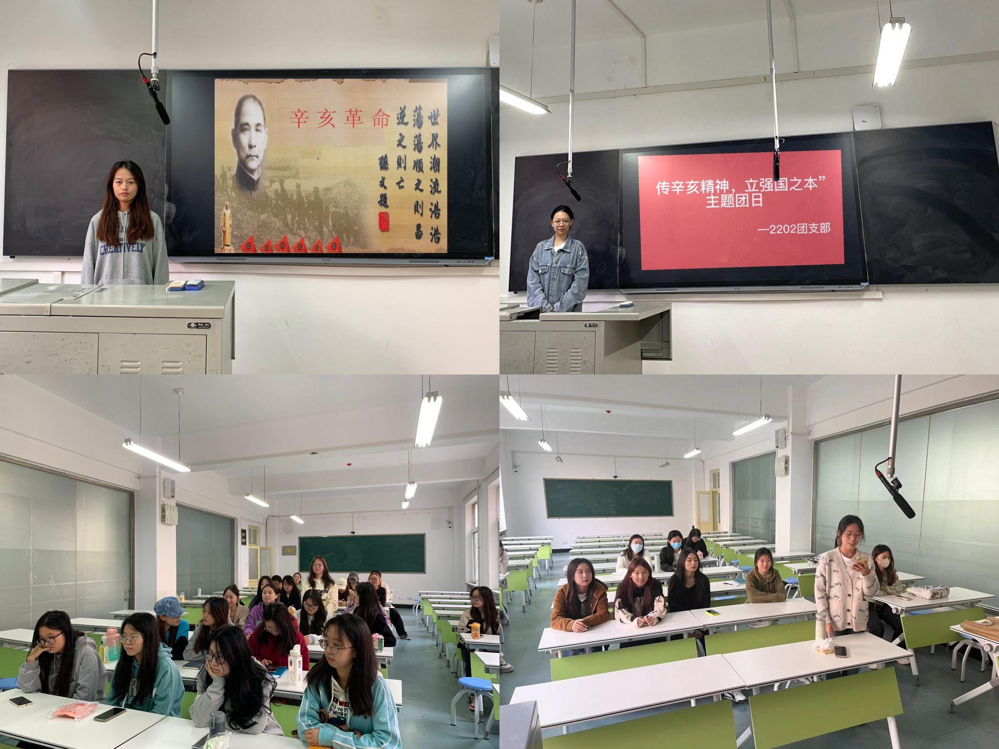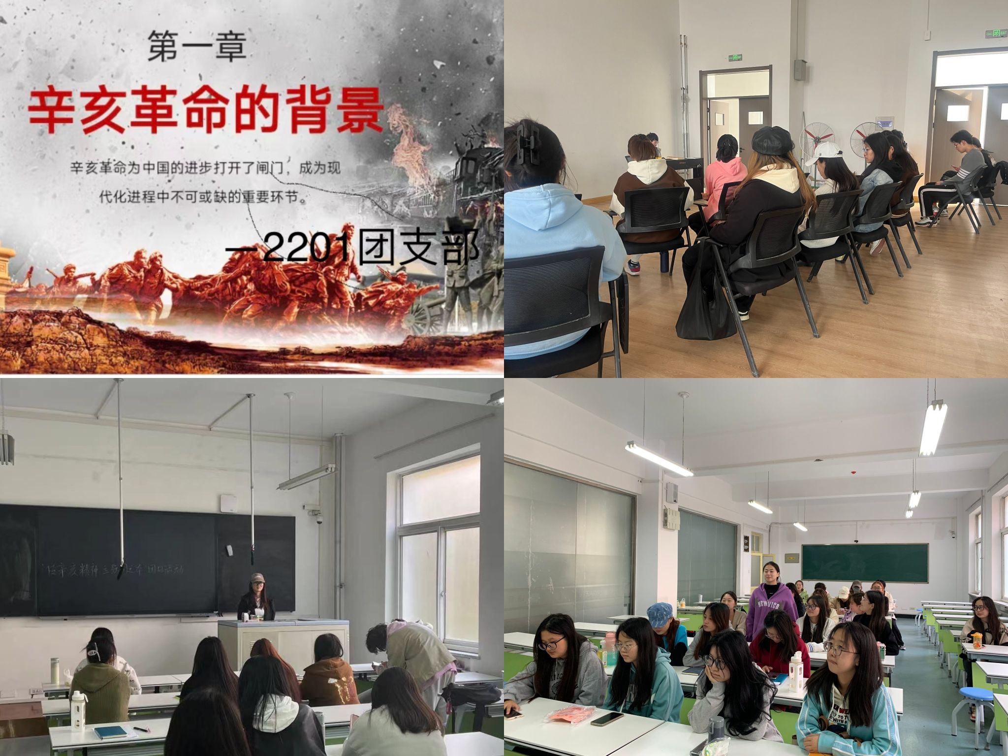 活动中,2201团支部组织同学们开展主题宣讲,激励同学们要以史为鉴、感悟革命精神,在全面建设社会主义现代化国家新征程上继续担当历史使命;2202团支部带领团员青年观看相关视频,回顾辛亥革命112年的历史,追忆峥嵘岁月、缅怀革命英烈;2203团支部组织团员青年开展诗歌朗诵,铿锵有力地声音表达了坚定的理想信念,担负起青春的使命,勤奋学习、锤炼身心,努力做新时代具有过硬本领和高尚品格的接班人。