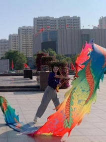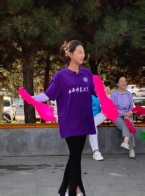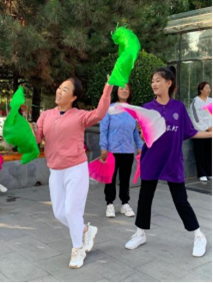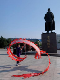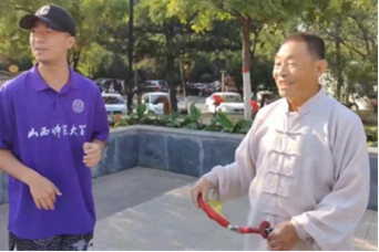 在广场一角风雷作响的鞭声引得队员们前往观赏,几位大爷握着把手,银色的鞭子在空中扭动,鞭尾的红绳发出清脆如雷的响声。这是由麒麟鞭演变而来的关公龙凤鞭,大爷们看着队员们畏畏缩缩扭曲的鞭子,和蔼地大笑,在教学中告诉我们:这鞭子早期也是一种兵器,我们这练了十多年的人,那可是能指哪打哪。大爷满脸的骄傲和高昂的精气神诉说着左权人民安居乐业的现状,打鞭时犀利的眼神又充满着鲜红的战斗精神。