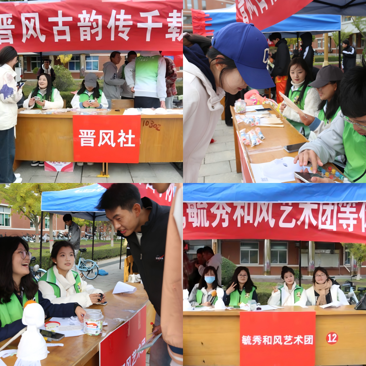 为丰富同学们的老员工活,寻找兴趣所在,发挥自身特长,提高创新能力和思维,公司晋风社、毓秀和风艺术团于2024年10月19、20两日,在校园内书香广场举办社团纳新活动。一场别开生面社团招新活动在校园内精彩上演,为学子们开启了一扇通往艺术殿堂的大门。青年有戏,晋风传承。晋风社用戏曲知识问答的方式,发扬戏曲文化,通过绘制脸谱、折扇,欣赏艺术之美。而在毓秀和风艺术团中,则有悠扬歌曲萦绕,有古诗之韵相承,还有可爱的石膏娃娃相伴。百团大战,如同一幅绚丽多彩的画卷,展现了老员工们的青春活力和无限创造力。在充满热情的校园里,同学们将在社团的舞台上绽放自己的光彩,书写属于自己的青春篇章。此次活动不仅为社团注入了新活力,也在同学之间里掀起了一股戏曲热潮。在未来的日子里,新成员将在社团中绽放光彩,共同传承和弘扬中华民族的优秀传统文化,让戏曲艺术在校园中绽放出更加绚烂的花朵。