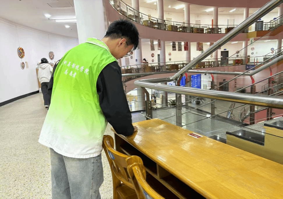 在和煦的春风中,身穿亮绿色马甲的志愿者们穿梭于图书馆各个角落,忙碌而有序,为校园阅读空间注入了温暖与活力。志愿者们认真擦拭每一张阅览桌椅,耐心清理地面上的污渍,并将阅览桌内的垃圾彻底清除。经过大家共同努力,图书馆焕然一新:地板光洁如新,桌椅整齐有序,为读者营造了一个“净、静、敬”的沉浸式阅读环境。